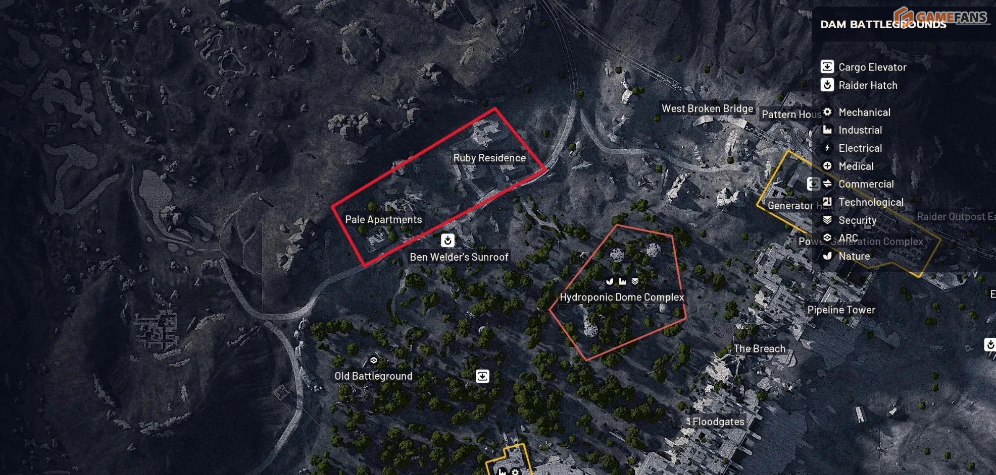 Менее известное, но безопасное место — северо-западный угол карты Поле битвы у Дамбы, где расположены Бледные апартаменты и Рубиновая резиденция. Эти районы не относятся к официальным точкам интереса, поэтому активность игроков здесь минимальна.