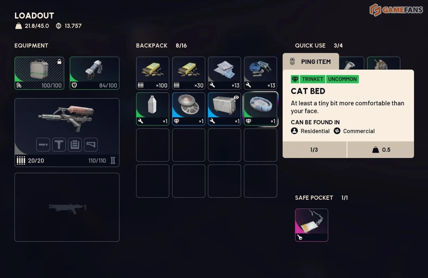 Храните находку в “Безопасном кармане”. В случае гибели предмет сохранится — это особенно важно, если вы добыли лежанку в опасной области.