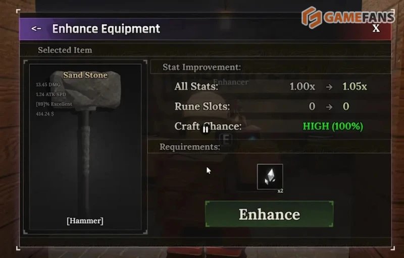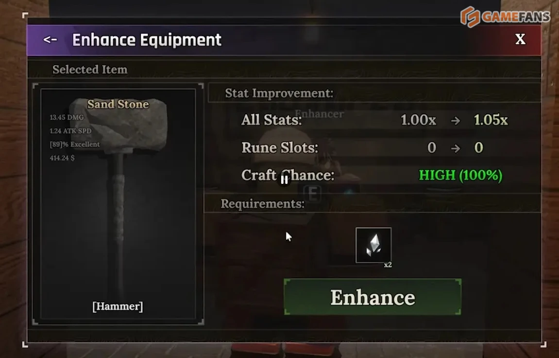 После разговора с мастером усиления открывается меню, где выбирается нужный предмет. Интерфейс сразу показывает, как изменятся характеристики вещи, какой множитель будет применен, каков шанс успешного апгрейда и сколько ресурсов потребуется. Для усиления всегда нужны эссенции, выпадающие с врагов, а также деньги. Чем выше уровень предмета, тем больше эссенций требуется и тем выше их редкость.