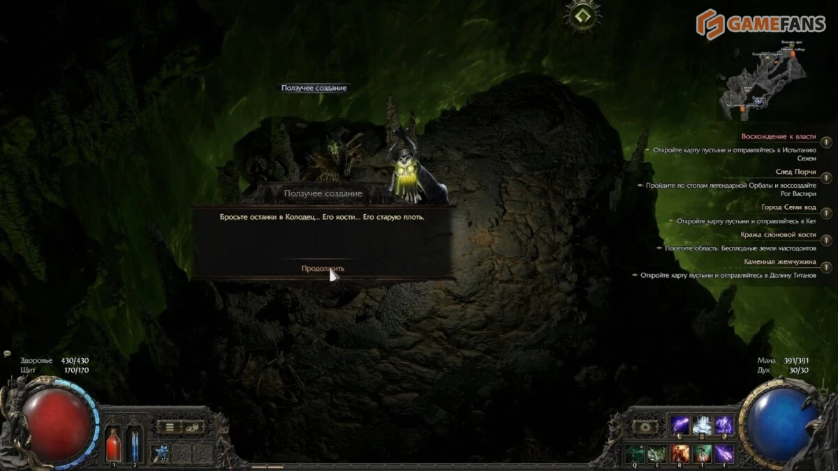 При первом вскрытии вы получите обглоданный фрагмент скелета, который запускает цепочку заданий, ведущих к источнику разломов. Дальше путь лежит в новую зону — Бессветный проход. Там, очистив пещеры, вы найдете вход в Колодец душ.