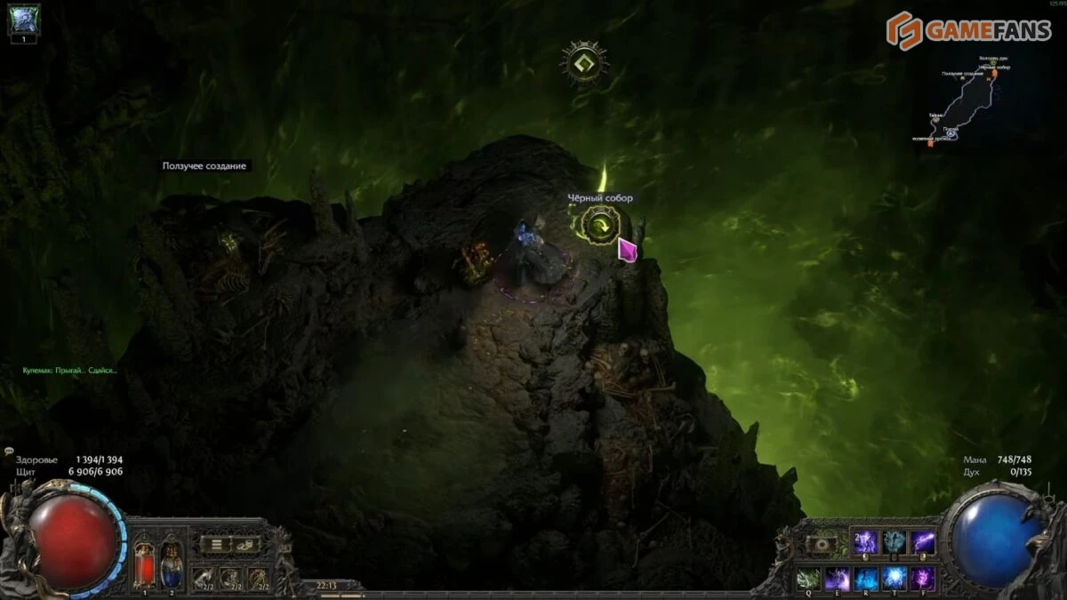 С полученным приглашением отправляйтесь в Колодец душ. Подойдя к пропасти, вы увидите новую активную кнопку — она появляется только при наличии проходки в инвентаре. Нажатие откроет портал и перенесет вас в глубины Черного собора.