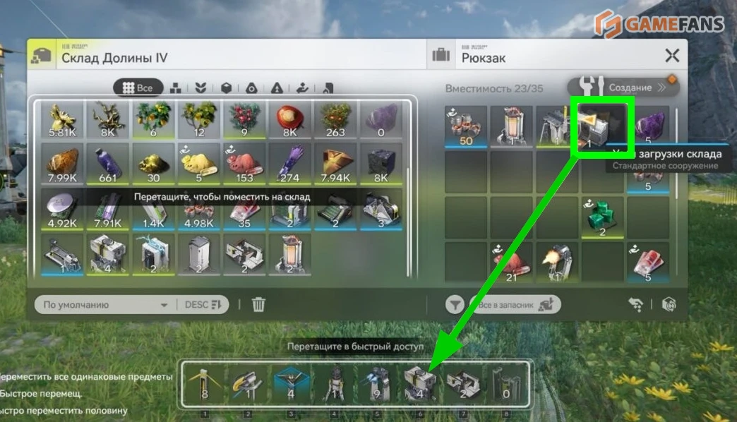 Склад ПБА — сердце всей логистики. Он не ограничен по количеству предметов, но для каждого ресурса существует один слот с лимитом хранения. Расширение осуществляется через улучшение складских узлов. При этом подавать материалы в модули можно напрямую со склада, не перегружая инвентарь персонажа, используя порты выхода ПБА.