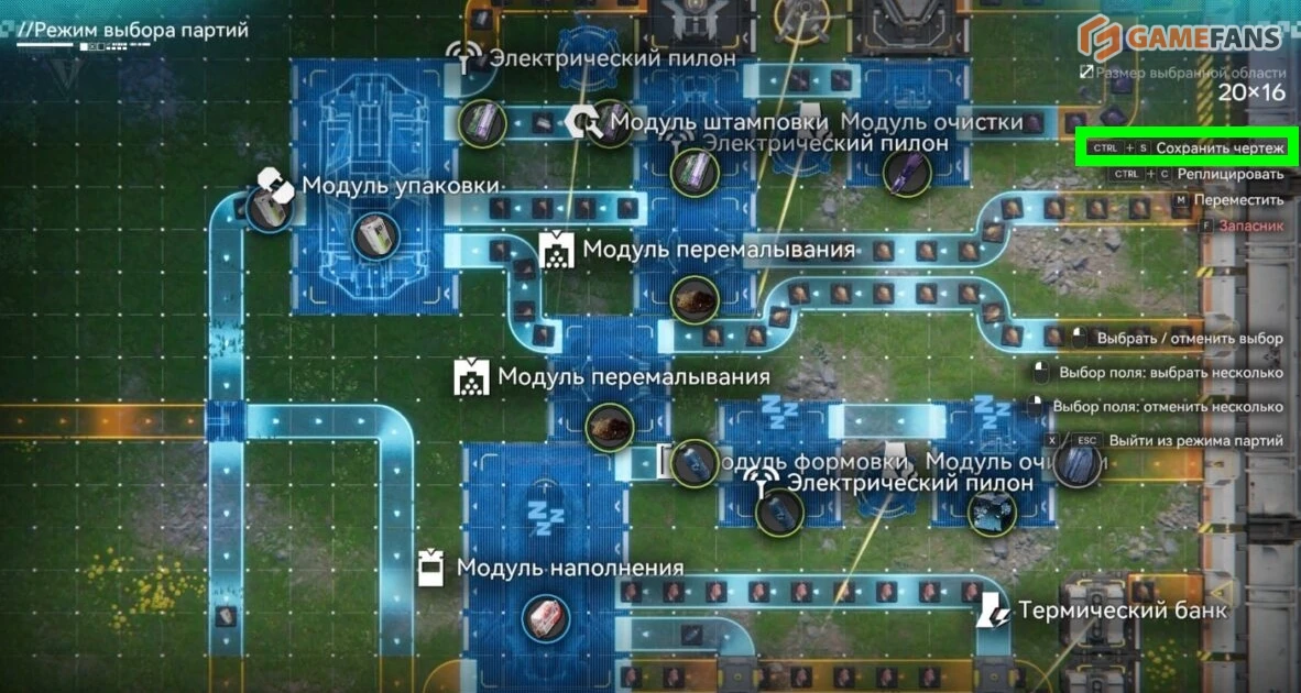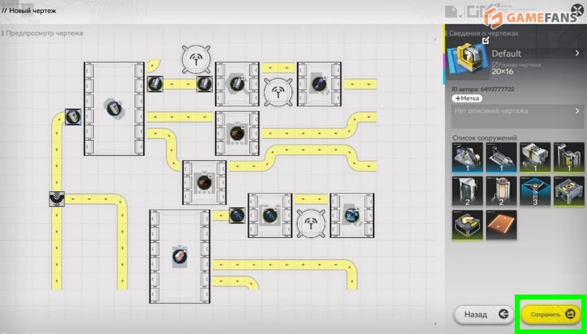 Чтобы сохранить свою схему, переключитесь в вид сверху в зоне АПК, выделите нужные постройки через "Массовое действие", затем выберите пункт сохранения чертежа. После этого останется лишь задать название, при желании добавить описание — и шаблон появится во вкладке "Мои чертежи".