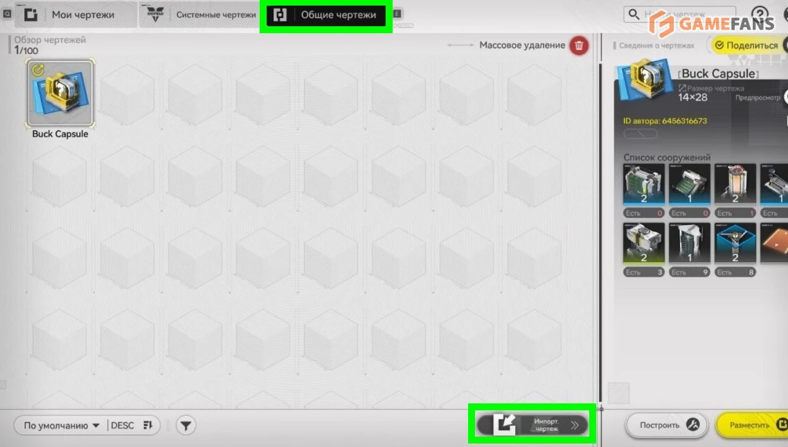 Импорт работает еще проще. В меню чертежей откройте раздел с общими схемами, нажмите кнопку импорта и введите ID-код. Перед размещением доступен предпросмотр — это удобно, чтобы убедиться, что постройки подходят под текущий уровень базы. Сохраненный шаблон можно в любой момент развернуть на своей территории практически в один клик.
