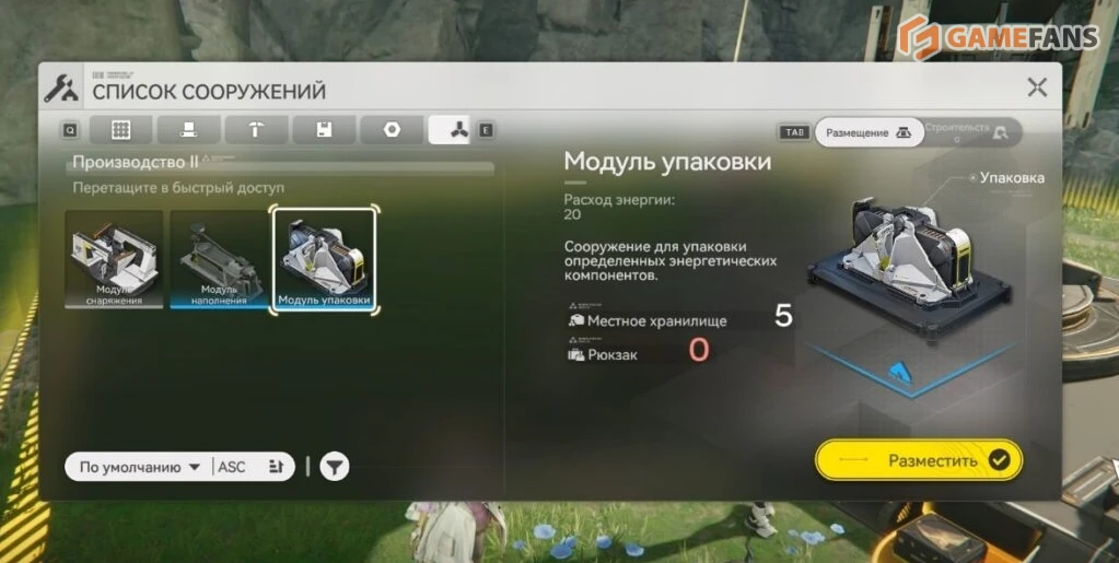 Отправляйтесь в лагерь беженцев и постройте изученный упаковщик рядом с суб-ПБА. Откройте список сооружений кнопкой в правом нижнем углу экрана и выберите нужный аппарат в категории "Производство II".