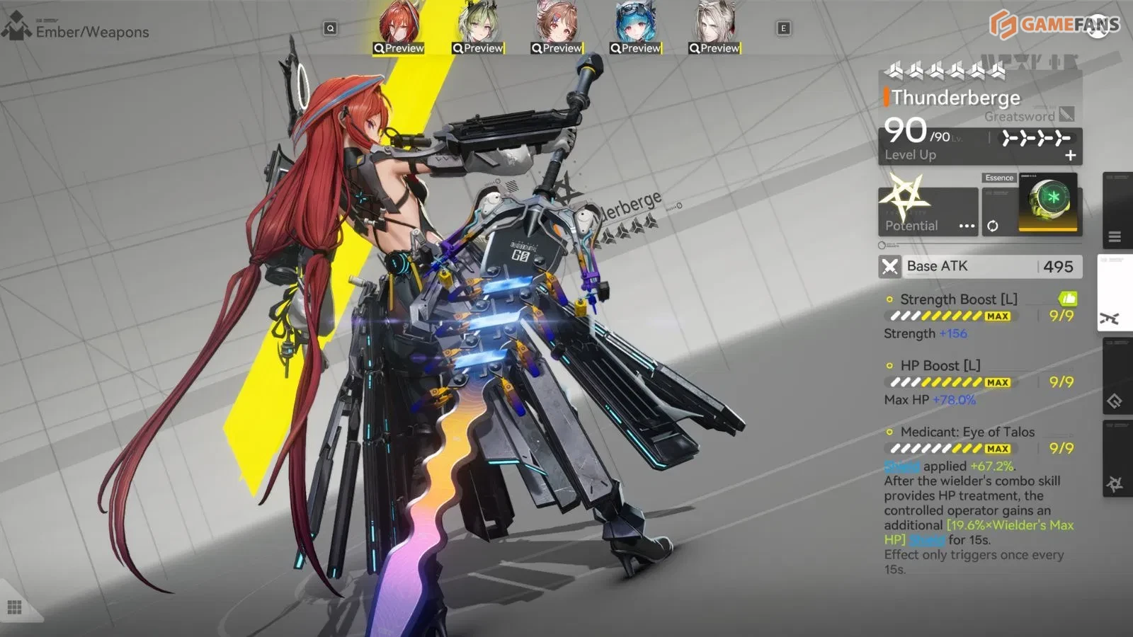 Thunderberge — это оружие Эмбер, ориентированное исключительно на защиту. Оно увеличивает максимальное количество здоровья и напрямую повышает все значения щита на 38,4%. Когда Эмбер лечит с помощью своего комбо-умения, это оружие также дает управляемому оператору дополнительный щит, основанный на максимальном количестве здоровья Эмбер, на 15 секунд.