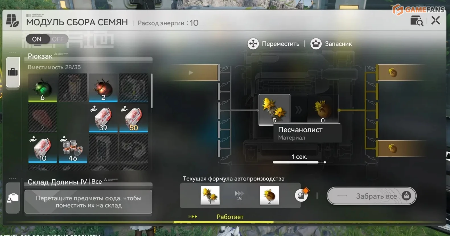 Перед вами универсальная схема, подходящая для выращивания любого растительного ресурса. Останется лишь открыть интерфейс модуля сбора семян и положить туда собранный ранее песчанолист. Система начнет работать следующим образом: из одного растения будут получаться два семени, которые отправятся в оба модуля посадки. Урожай из одного модуля вернется обратно для поддержания цикла, а из второго — будет автоматически складироваться.