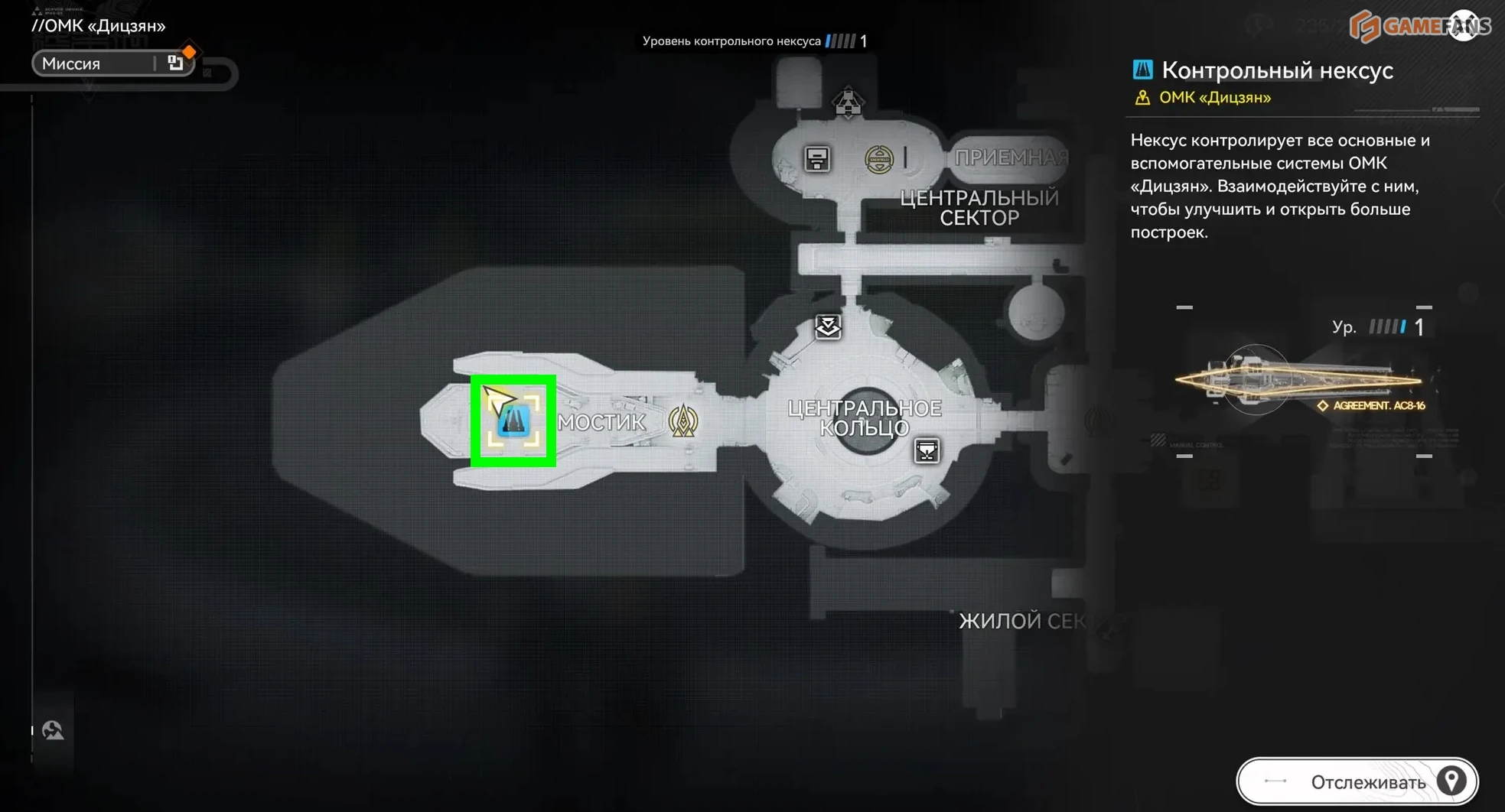 Переместившись на мостик, можно взаимодействовать с Контрольным нексусом — специальным узлом управления. Здесь выбирается оперативник, который будет назначен на работу. Пока персонаж находится на посту, уровень его Доверия постепенно растет автоматически.