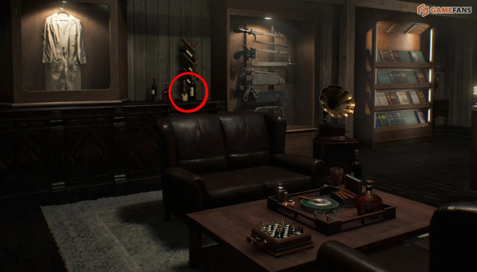 Далее подойдите к стойке с бутылками у левой стены и осмотрите бутылку вина. Поверните ее так, чтобы части рисунка совпали, затем раздвиньте конструкцию и получите модель двойной спирали.