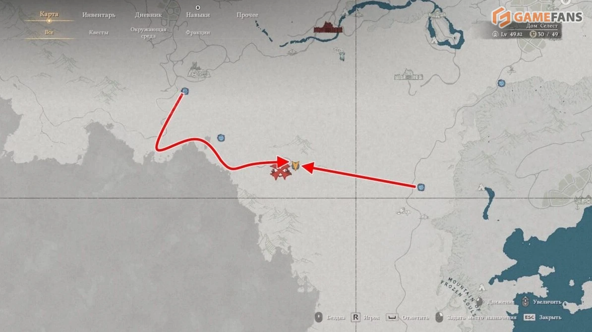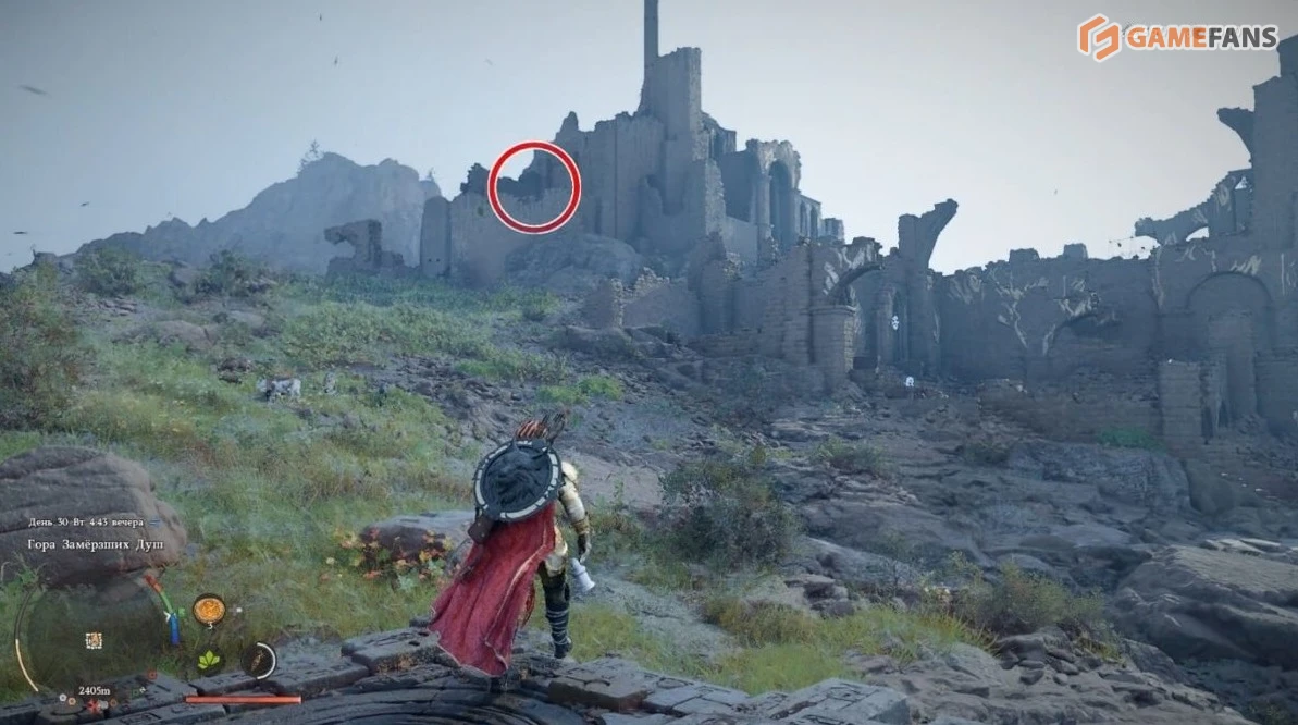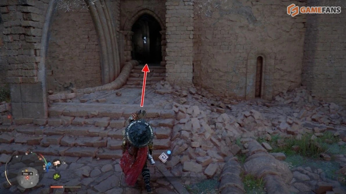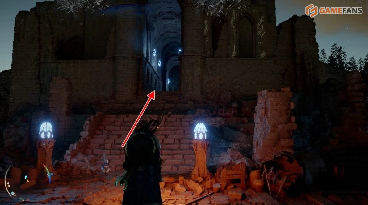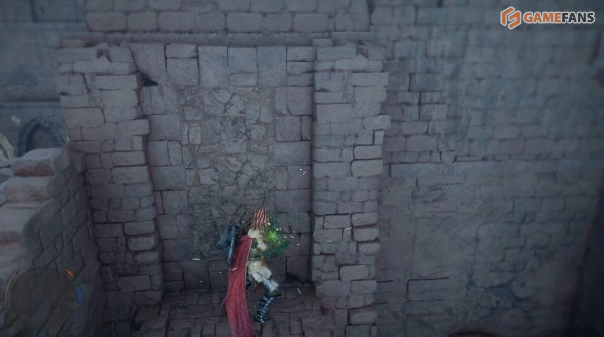 Попасть в скрытую комнату напрямую не получится — вход находится снаружи. Поднимитесь на стену руин со стороны Средоточия Бездны. Когда окажетесь у задней стены помещения с сундуком, из кладки выдвинется платформа.