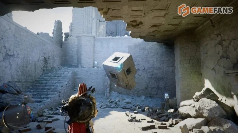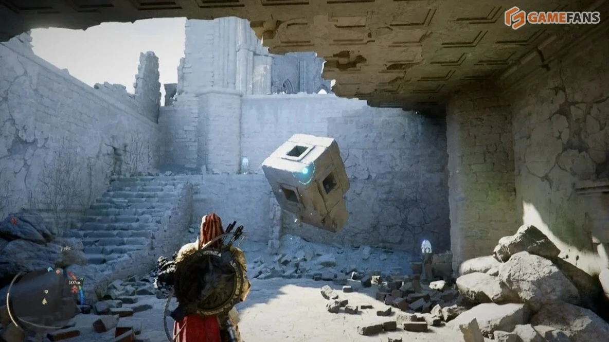 Подхватите этот объект с помощью способности «Сила Аксиомы» (L3 на PlayStation 5, LS на Xbox или Tab на клавиатуре). Перенесите куб к месту головоломки и установите его прямо над углублением. После этого заберитесь на конструкцию и выполните «Удар пальмары» в прыжке (колесо мыши на ПК или правый стик/R3 на геймпаде), чтобы восстановить колонну и завершить этап испытания.