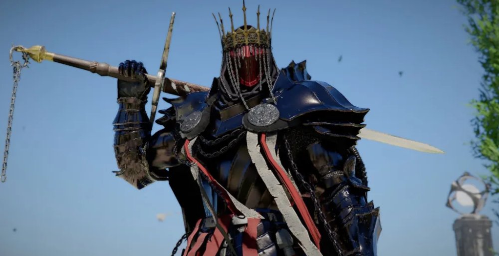 Тяжелый комплект в мрачной стилистике, также без шлема. Плащ скрывает лицо железной маской, которую можно снять через радиальное меню экипировки.