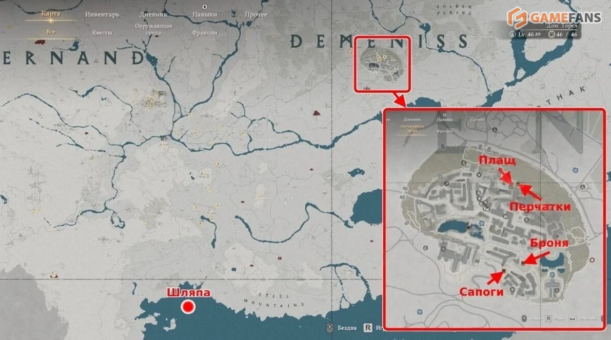 | Кожаные сапоги Хелфрина | Юг города Деменисс | Вход в тайник расположен за южной стеной города. Найдите прикрытую досками дыру. |