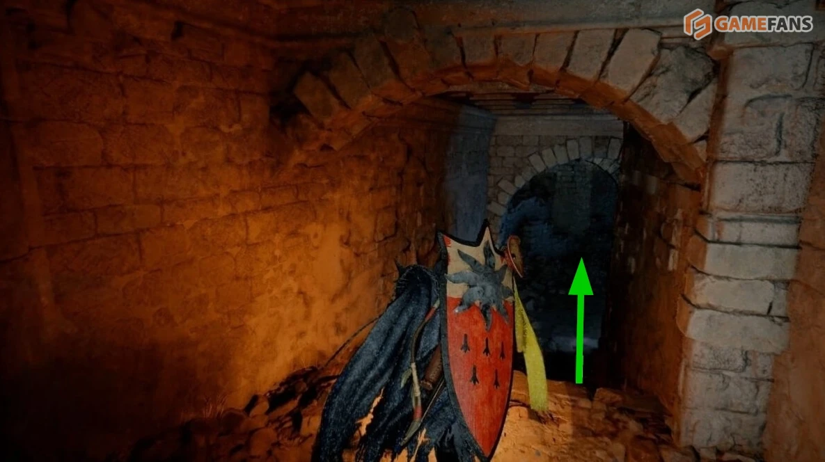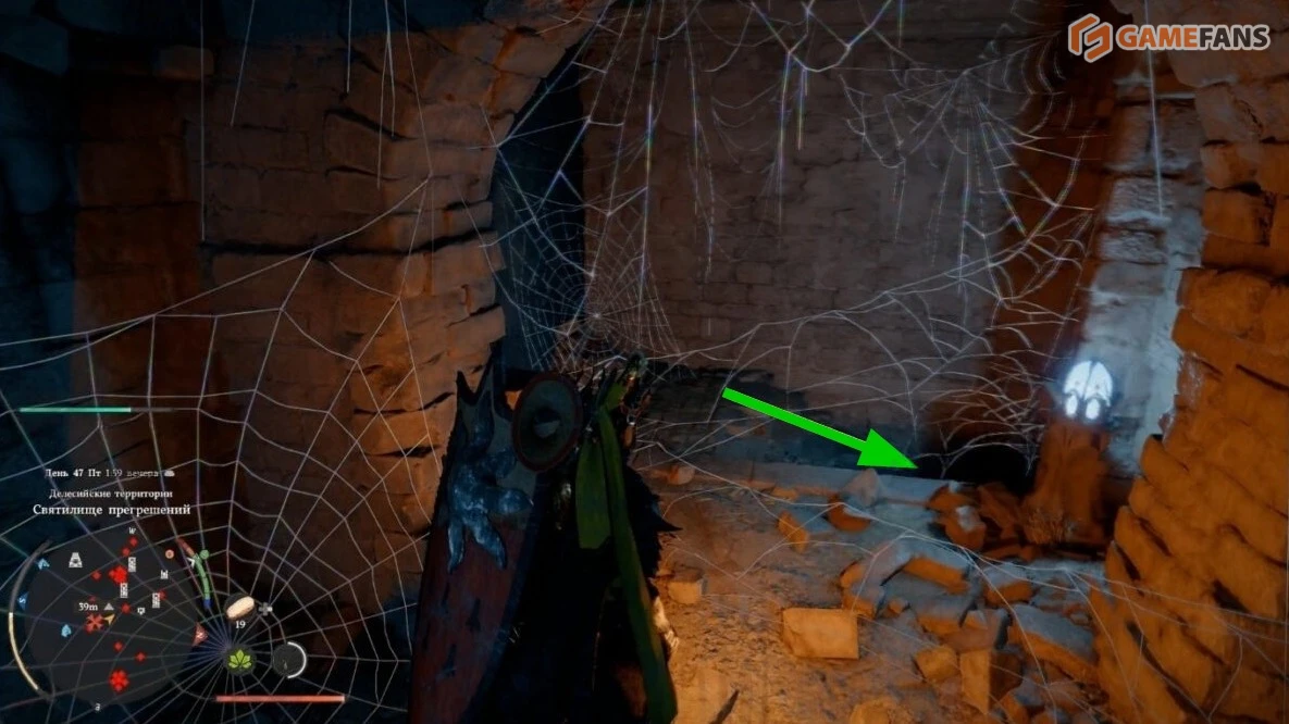 После входа пройдите через арку, поверните направо и спуститесь по лестнице, покрытой паутиной. Внизу вы обнаружите помещение с ядром, необходимым для решения основной головоломки святилища. В этой же комнате находится каменный факел — зажгите его, и решетка за проломом в стене откроется.