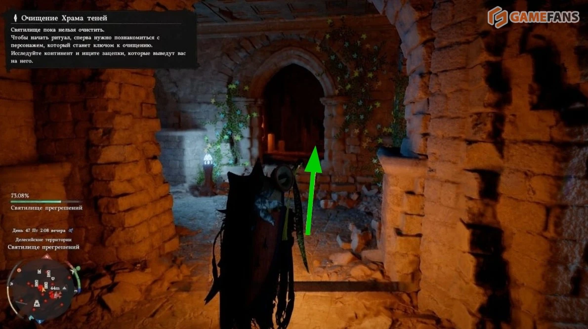 После этого вернитесь ко входу и двигайтесь вперед. Если вы еще не сталкивались с Ведьмой смирения, то услышите ее голос — она предупредит, что время испытания еще не наступило.