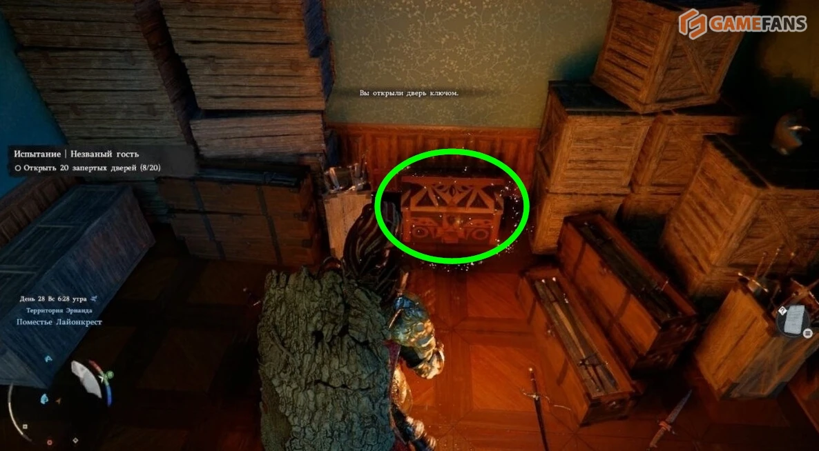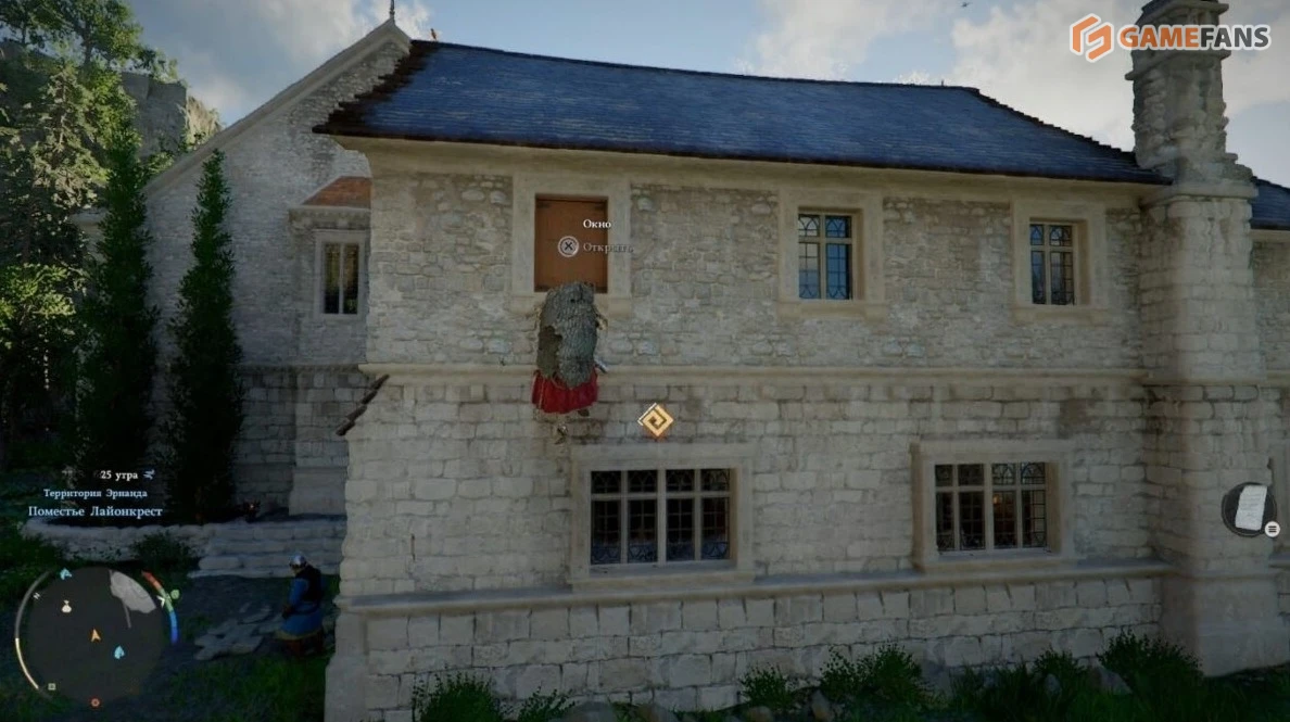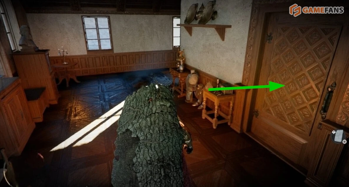 Нужная комната находится на втором этаже отдельно стоящего здания, расположенного слева от главного входа. Если вы еще не проходили сюжетную линию дома Альфонсо, охрана не позволит пройти внутрь. Обойдите здание с южной стороны и заберитесь внутрь через окно с закрытыми деревянными ставнями.