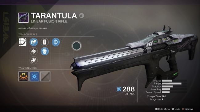 Почему нам нравится это оружие: линейно-плазменные винтовки являются нововведением во вселенной Destiny, но, черт побери, от них столько веселья! Тарантул, как и Безымянная полночь, имеет «Точную раму», которая позволяет наносить меткие попадания энергетическими снарядами с большого расстояния, но еще у Тарантула есть «Чеканные нарезы», которые увеличивают непосредственно дальность стрельбы. «Суженный ствол» повышает как дальность стрельбы, так и стабильность. Для оружия также доступен бонус, улучшающий показатели дальности, стабильности и удобства. И, наконец, еще два перка, первый из которых понижает отдачу, а второй — увеличивает скорость выстрелов, если вы дольше смотрите в прицел. Не плохой набор, да?