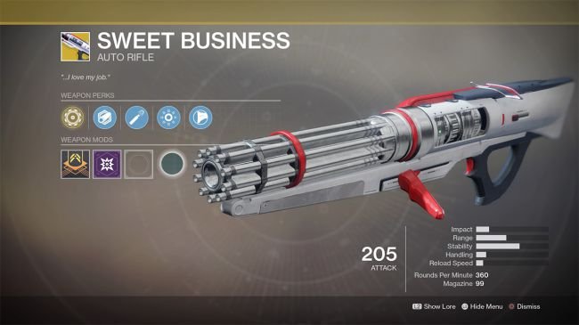 Почему нам нравится это оружие: Ну, во-первых, из-за названия. А во-вторых — из-за дизайна (если Вы разработчик из Bungie и читаете эту статью, то благодарим Вас — в плане дизайна Милого дела к Вам нет никаких претензий!). Возвращаясь к игровым характеристикам Милого дела, необходимо отметить, что автомат стреляет крупнокалиберными патронами и обладает повышенной точностью при стрельбе от бедра.