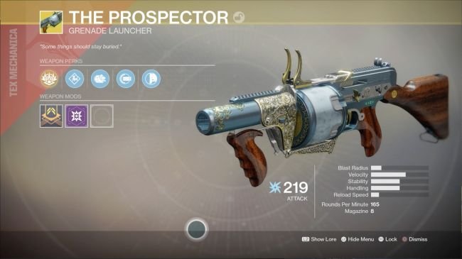 Почему нам нравится это оружие: Кому бы не хотелось иметь экзотический гранатомет для уничтожения боссов в режиме Налет или для ликвидации других Стражей в «Горниле»? Старатель как раз идеален для таких целей, и вдобавок у него есть несколько полезных перков. Один из бонусов позволяет выстрелить до восьми гранат за один раз и взорвать их одновременно нажатием на спусковой крючок. Само оружие выглядит как что-то, пришедшее из сеттинга Дикого Запада.