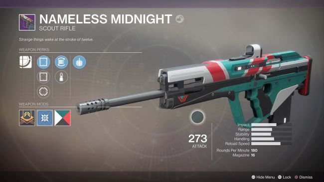 Почему нам нравится это оружие: Доступная к получению только у Завалы, Безымянная полночь по праву является одной из лучших винтовок разведчика. Оборудованное «Точной рамой», «Коллиматором 2 МОА» и «Расширенным магазином» — каждый из которых увеличивает точность, дальность стрельбы и удобство соответственно — это оружие быстрее любой другой легендарной винтовки разведчика, которая может попасться вам в игре. Но самым главным преимуществом здесь является «Фугасный снаряд» — этот бонус заставляет пули взрываться при столкновении с какой-либо поверхностью, что делает винтовку безупречной для PvE и «Горнила».