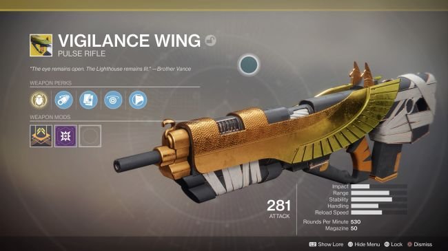 Почему нам нравится это оружие: Эта экзотическая импульсная винтовка просто монстр в PvP. Во-первых, она стреляет очередями по пять патронов с высокой скорострельностью и стабильностью, что позволяет вам быстро ликвидировать противников на расстоянии. Перк «Суровые истины» означает, что в случае, если ваш союзник был убит, ваше здоровье немедленно восстанавливается, а скорость передвижения возрастает. В «Горниле» такие на редкость полезные свойства позволяют быстро восстановить здоровье и отомстить за товарищей. «Легкосплавный магазин» увеличивает скорость перезарядки при пустом магазине, а «Последний герой» повышает характеристики оружия, когда вы остаетесь последним живым членом команды — идеально для игры в режимах Налет и Рейд. Ну, а самое главное — просто посмотрите, как круто выглядит Крыло бдительности!