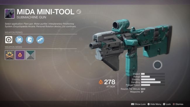 Почему нам нравится это оружие: К тому моменту, когда на вас свалится Мини-инструмент MIDA, вы наверняка будете вовсю проходить квесты, но не торопитесь списывать этот пистолет-пулемет со счетов. С этим оружием в руках вы будете быстрее передвигаться, получите очень высокий уровень удобства и слегка увеличенную стабильность, а также быструю перезарядку при пустом магазине. Экипируйте данный пистолет-пулемет одновременно с экзотическим Универсальным инструментом MIDA и вы будете продолжать получать бонусы к скорости, даже играя с Универсальным инструментом (лайфхак для Испытаний). Класс, да?