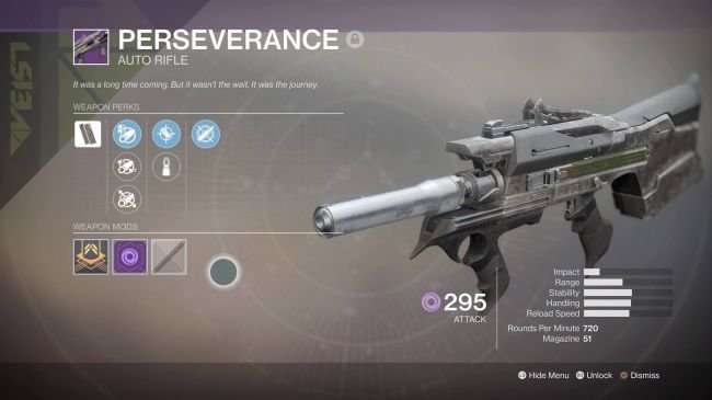 Почему нам нравится это оружие: С самого релиза многие считают автоматы одним из лучших видов оружия для «Горнила». Один из автоматов — Perseverance — как раз-таки и зацепил наше внимание. И не только потому, что он выглядит опасно. Надо признать, что 720 выстрелов в минуту это уже неплохо, но еще есть ускоренная перезарядка при пустом магазине, которая может сыграть решающую роль в ситуации «либо ты — либо тебя». С увеличением стабильности/точности по мере опустошения магазина, это оружие вообще становится лютым зверем. В общем, с этой пушкой шутки плохи.