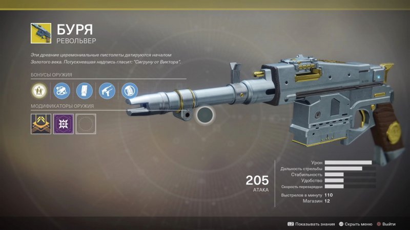 Почему нам нравится это оружие: Буря — это в принципе отличный револьвер. Удлиненный ствол позволяет ему стрелять на более протяженной дистанции, чем аналогичное оружие, а увеличенный магазин позволяет оставаться в бою дольше (хотя этому противопоставлена медленная перезарядка). Помимо этого, убийства из энергетического оружия увеличивают урон Бури от прицельных выстрелов до следующей перезарядки. Как бы там ни было, главным бонусом является то, что убийства из Бури заряжают ваше энергетическое оружие. Но есть кое-что еще: квест по получению Бури включает в себя использование энергетического пистолета под названием Натиск. Натиск в свою очередь «кооперируется» с экзотической Бурей и перезаряжает ее (и только ее), когда вы убиваете врагов. Поэтому если у вас в экипировке оба этих пистолета, чередуйте их — боезапас Бури и Натиска всегда будет полным. Натиск, кстати — отличное второстепенное оружие для «Горнила».