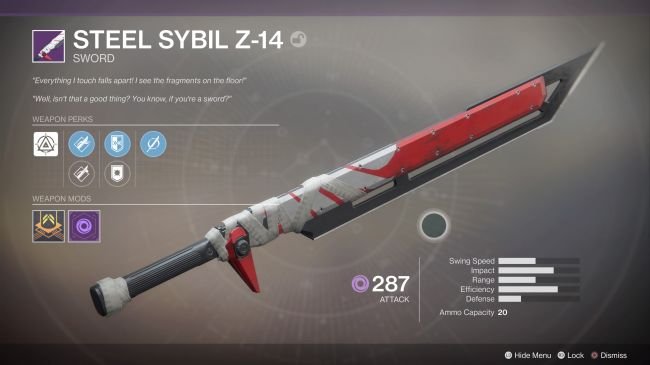 Почему нам нравится это оружие: На сегодняшний момент в игре есть неплохой ассортимент мечей, доступных для помещения в слот силового оружия, но мы особенно впечатлились характеристиками именно этого меча. Steel Sybil Z-14 выпадает в качестве награды за участие в «Горниле». Из бонусов можно выбрать либо тот, что повышает урон (правда, за счет ваших боеприпасов), либо тот, что улучшает эффективность оружия в ущерб защитным качествам (есть также перк с обратными характеристиками). Но что бы вы ни выбрали из перков, этот меч все равно будет эффективным методом сокрушения Стражей в ближнем бою.