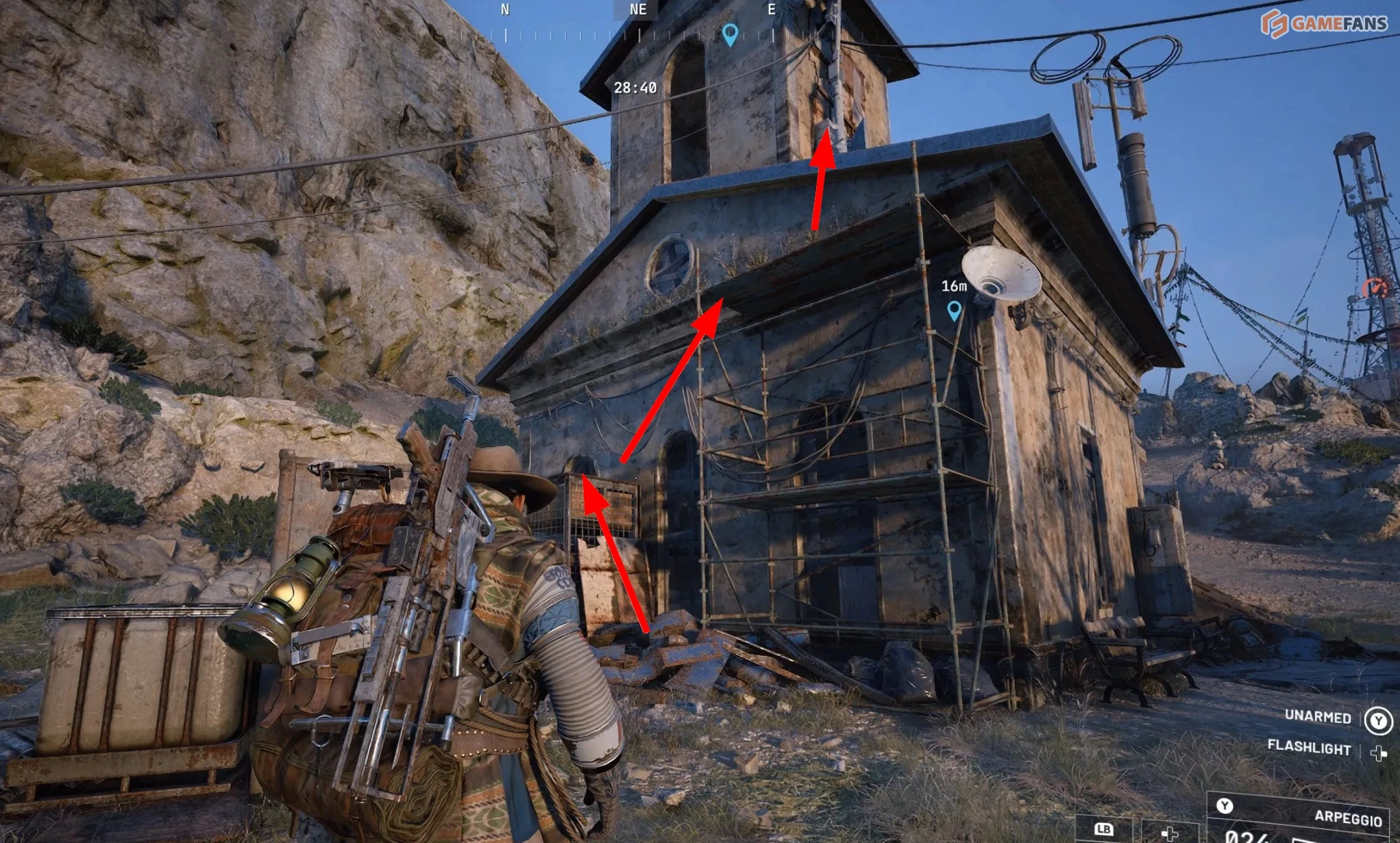 По прибытии вы увидите полуразрушенное здание, окруженное строительными лесами и техникой. Используйте боковые платформы, чтобы подняться на крышу. Там расположены две спутниковые тарелки, но активировать нужно только одну. Взаимодействуйте с ней, после чего антенна начнет вращаться и зафиксируется на нужной позиции.