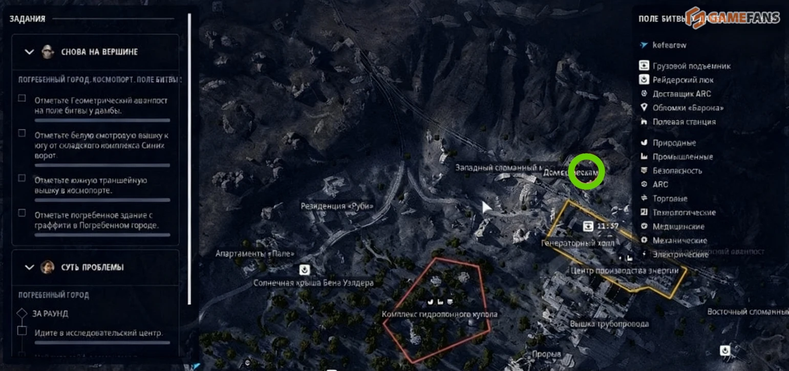 Первая цель описана довольно туманно, но под «Геометрическим аванпостом» подразумевается Дом с фресками — здание у северо-восточной границы локации. Его легко узнать по ярким рисункам на стенах.
