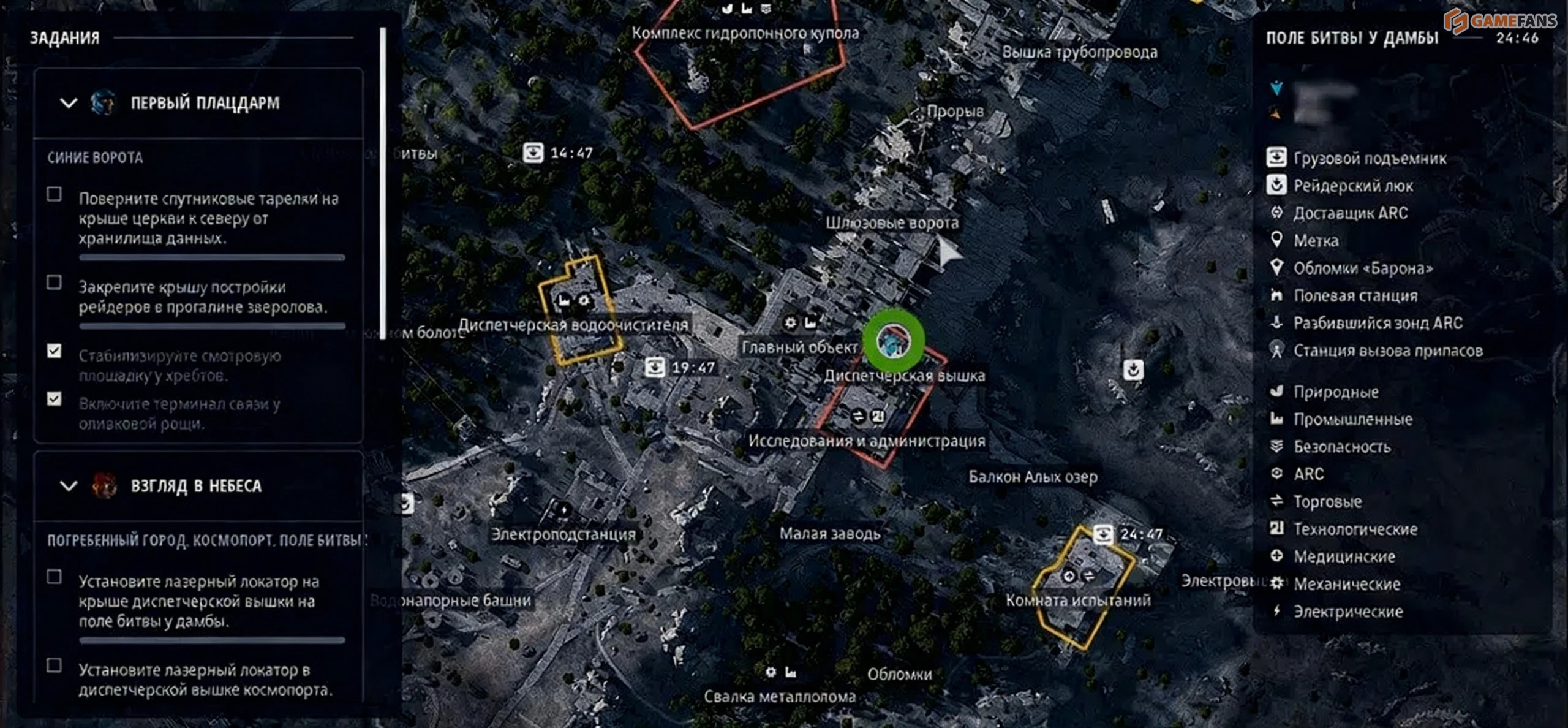Цель проста: разместить три лазерных локатора на ключевых высотных объектах. Устройства выделены золотым цветом, и после взаимодействия с ними этап засчитывается. Делать это можно в любом порядке, а сам квест не требует возвращаться живым — прогресс сохраняется даже после гибели.
