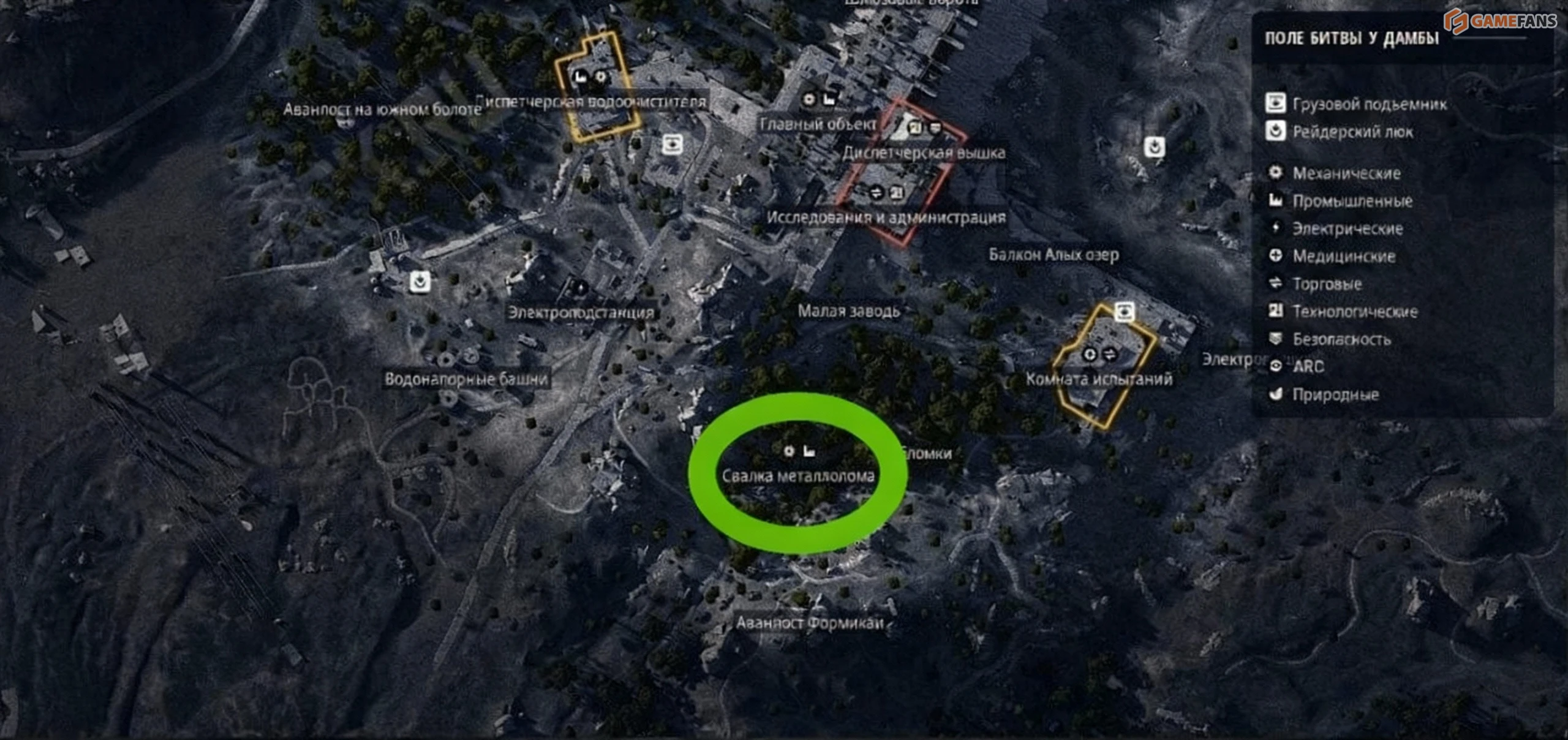 Первым ориентиром становятся вытянутые бежевые грузовики, которые стоят западнее центра свалки. Они образуют узкий проход, напоминающий импровизированный коридор. Именно здесь спрятан контейнер с компасом — не в легковых автомобилях, которых в округе множество, а именно между этими двумя большими грузовыми машинами.