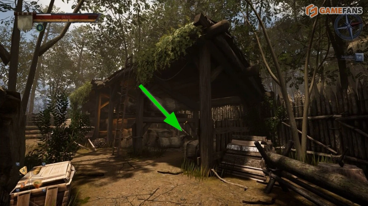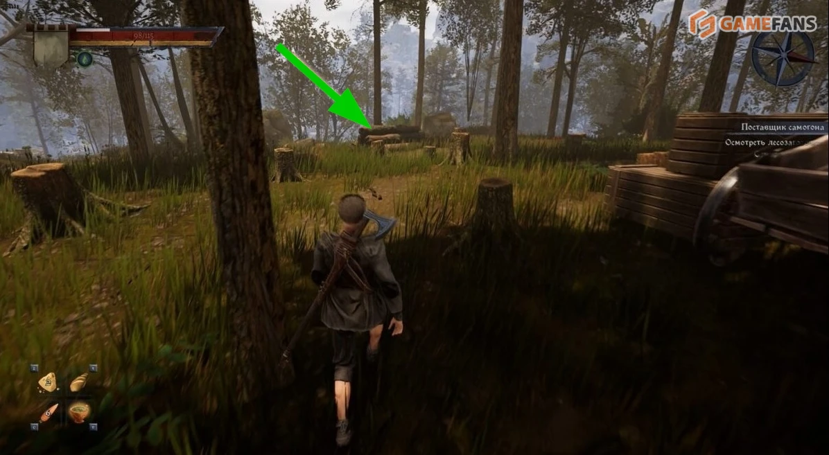 После беседы с Акимом отправляйтесь на поляну напротив лагеря лесорубов. Там, рядом с дальней тропой, лежат бревна — именно возле них находится первая улика. Достаточно подойти к подсвеченной точке, и этап автоматически будет отмечен как выполненный.