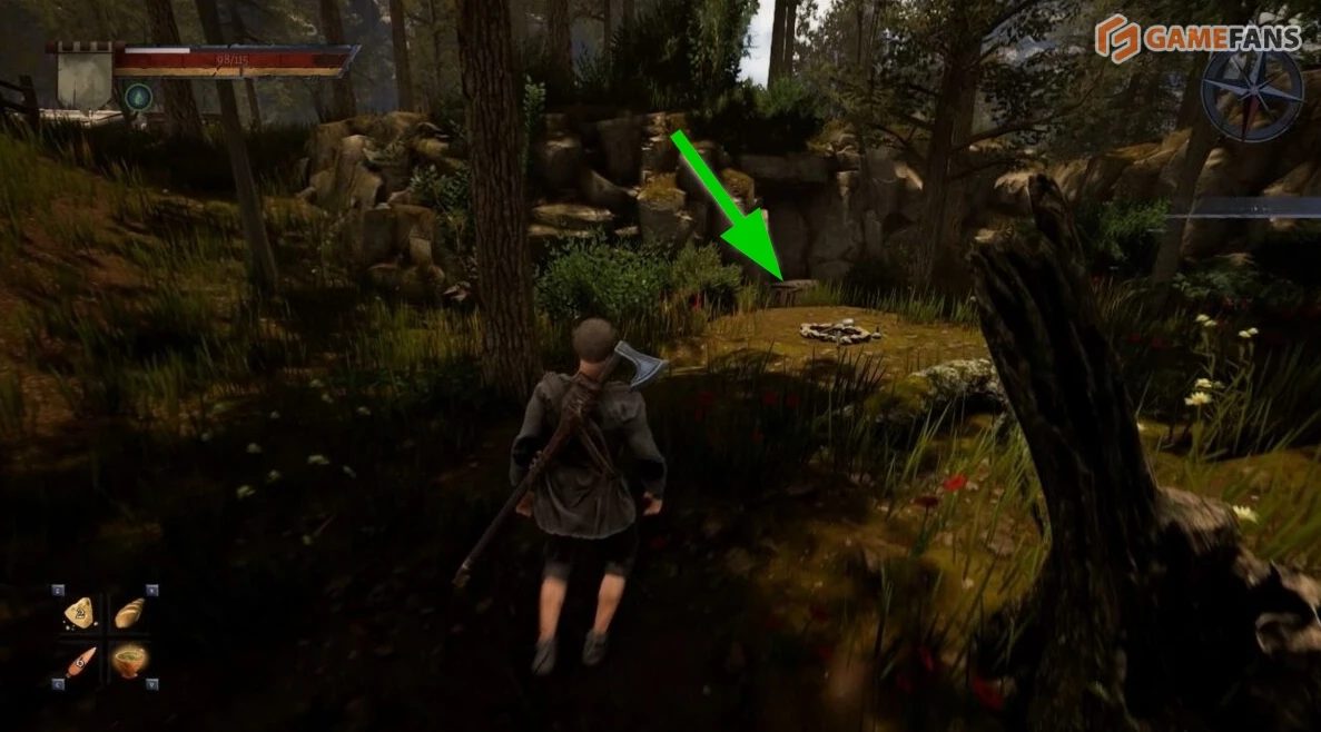 От жилища рабочих двигайтесь по левой тропе и сверните в чащу возле деревянного забора. Ориентиром служит потушенный костер — прямо напротив него стоит сундук с бутылками "Ржонки". Очень важно не взаимодействовать с этим тайником до завершения диалога с торговцем, иначе существует риск сломать скрипты задания.