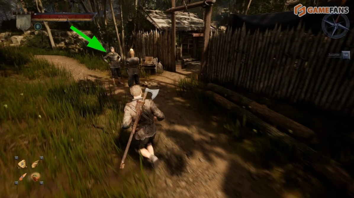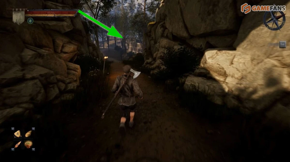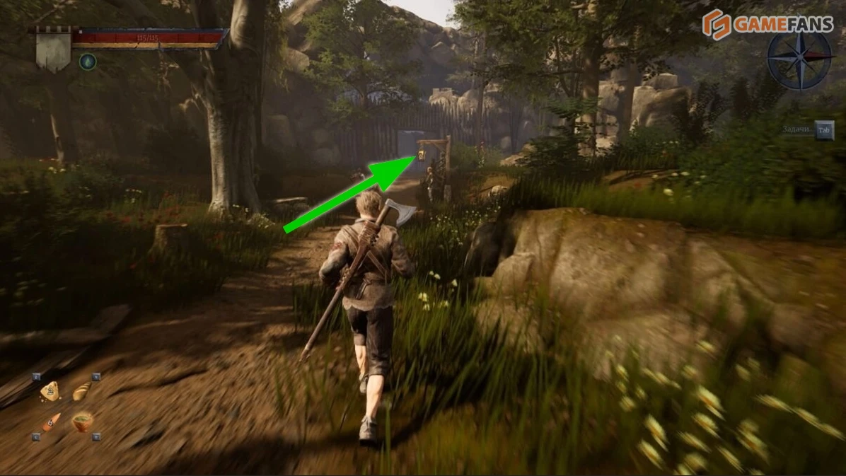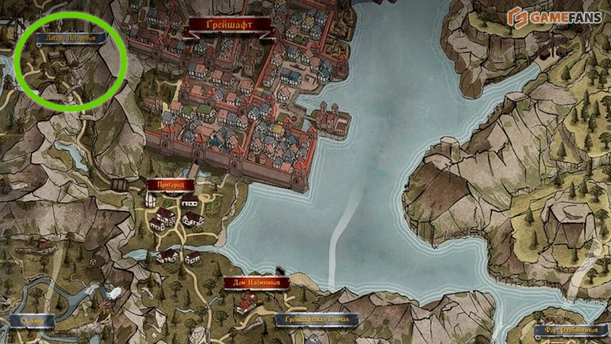 Оказавшись в Пригороде, двигайтесь по основной дороге мимо мельницы. На развилке с указателем сверните налево и войдите в проем деревянного ограждения. Далее дорога уходит в горную местность и превращается в извилистый серпантин. Важно не сворачивать с тропы и не пытаться срезать путь через скалы — это может привести к лишним боям и потере времени. На выходе из горной зоны вы увидите постройки из грубо обработанного бруса — это и есть лагерь лесорубов.
