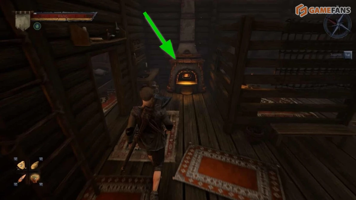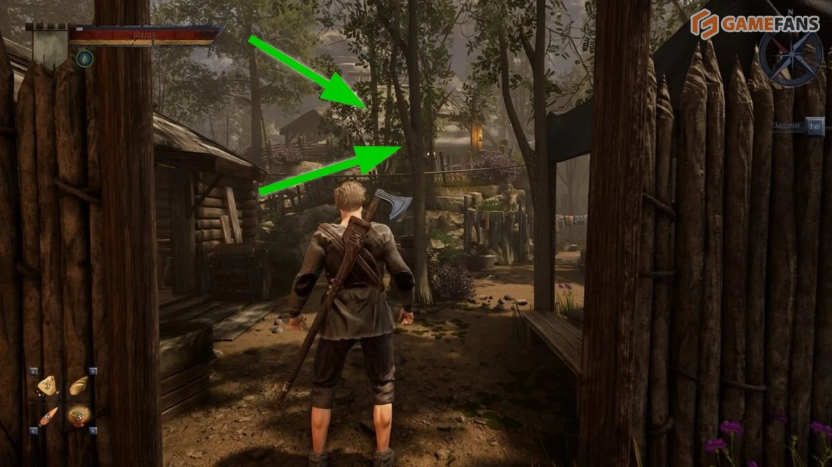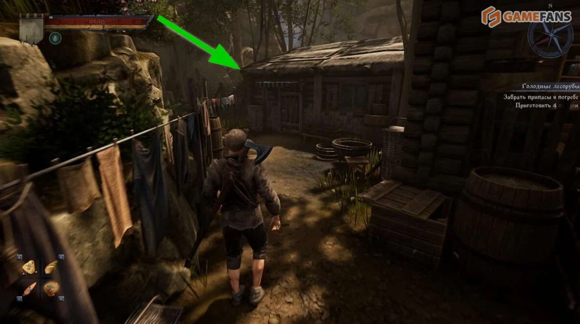 Внутри вас встретит молодой злокрыс. Противник не представляет серьезной угрозы, но игнорировать его не стоит — после победы вы сможете обыскать подсвеченный мешок с припасами. Помимо ингредиентов для похлебки, внутри лежит Одежда лесоруба. По характеристикам она превосходит нагрудник, ранее полученный от Нереста, и станет хорошим временным вариантом брони на начальных этапах игры.