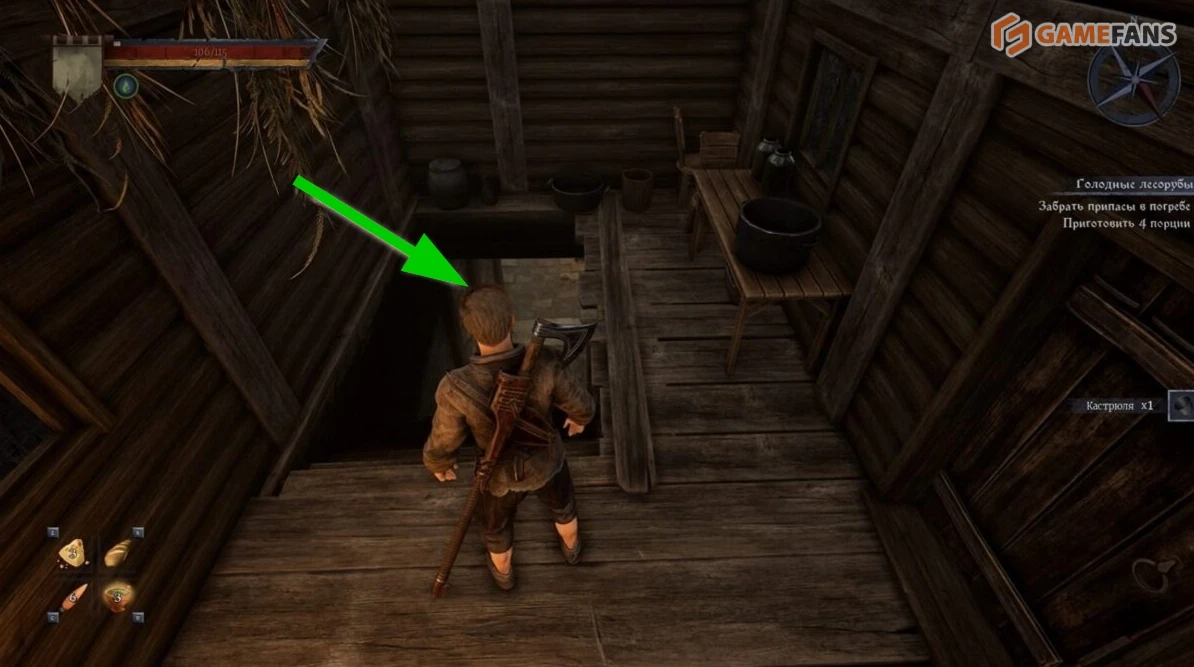 На территории лагеря поверните направо и направляйтесь к небольшой лачуге, расположенной рядом с развешанными на просушку портками. Используйте ключ, полученный от Акима, чтобы отпереть дверь, и спуститесь в погреб.