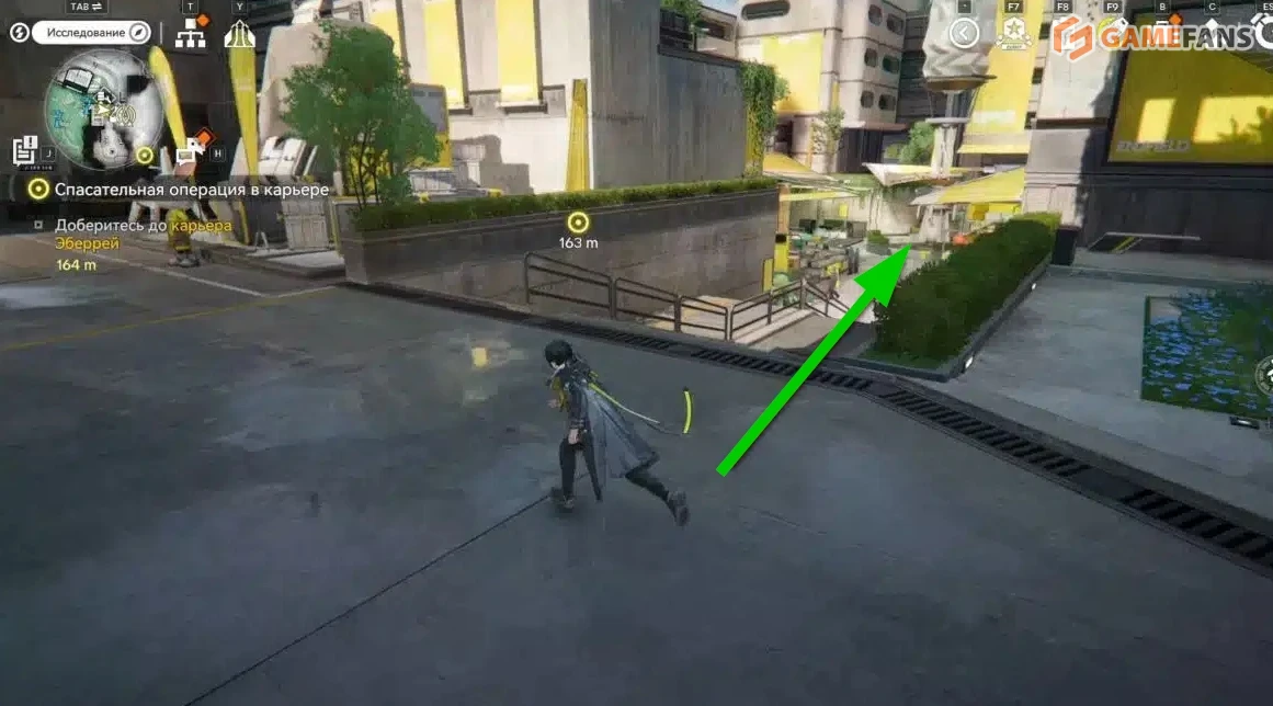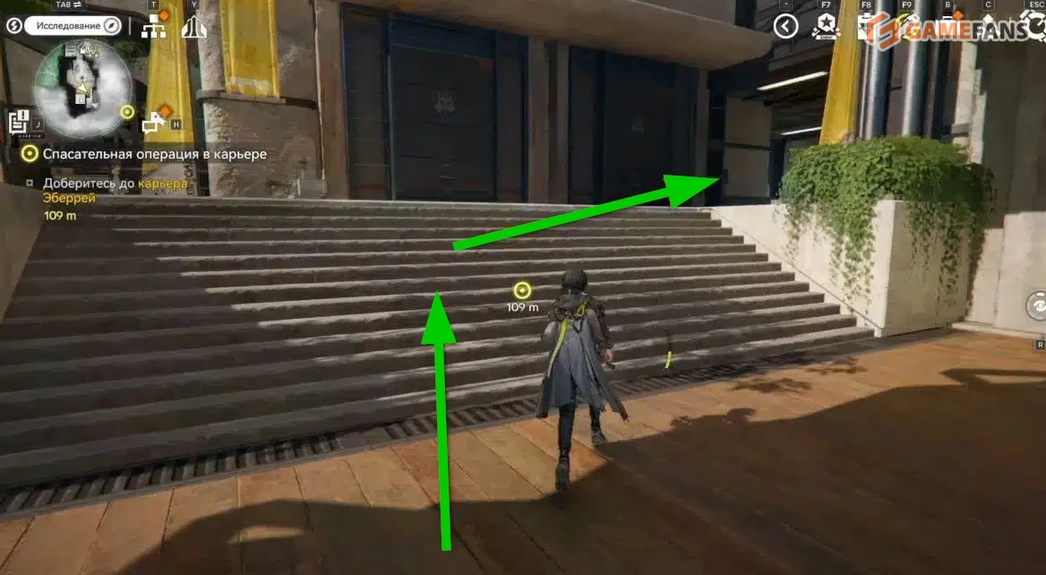 Оптимальный путь начинается от точки быстрого перемещения в Общежитии рабочих центра, расположенной в юго-восточной части карты. После телепорта развернитесь в сторону торгового квартала и двигайтесь прямо, не сворачивая, пока не увидите две лестницы, ведущие наверх.