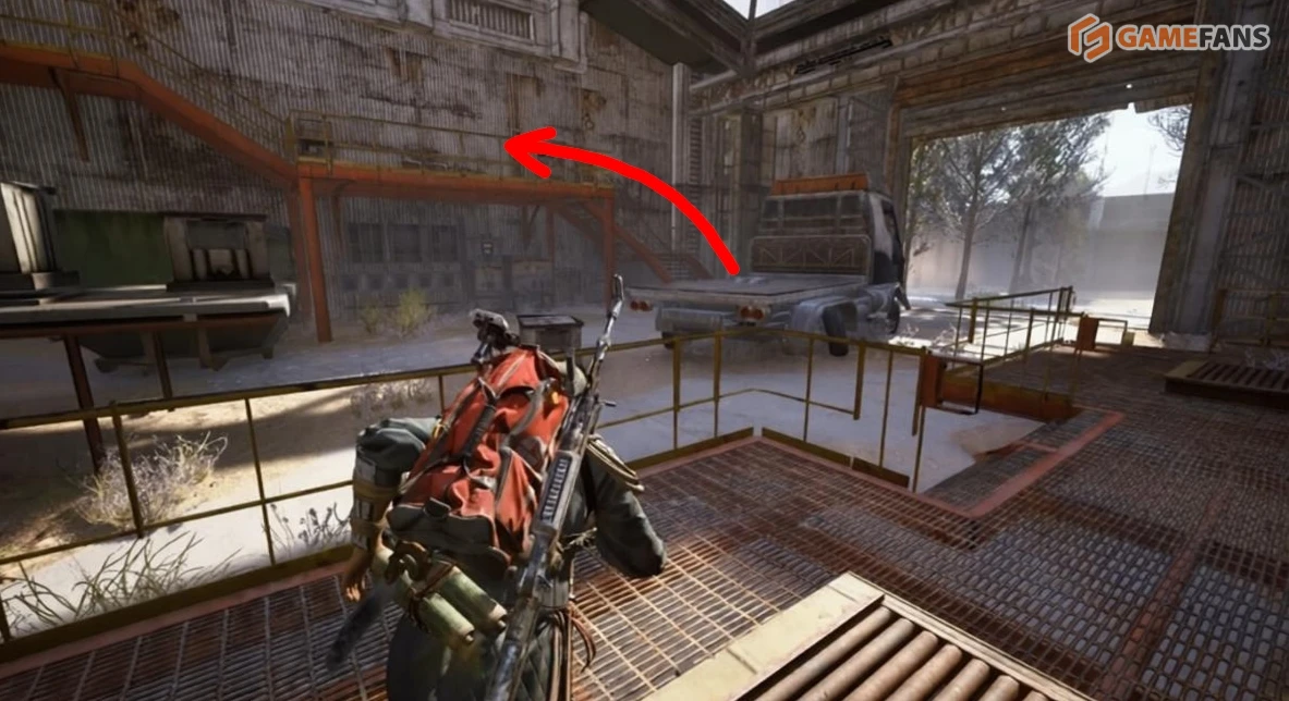 Осмотритесь вокруг и найдите красную лестницу, ведущую на верхние платформы. Поднимитесь по ней и перемещайтесь по металлическим мосткам.