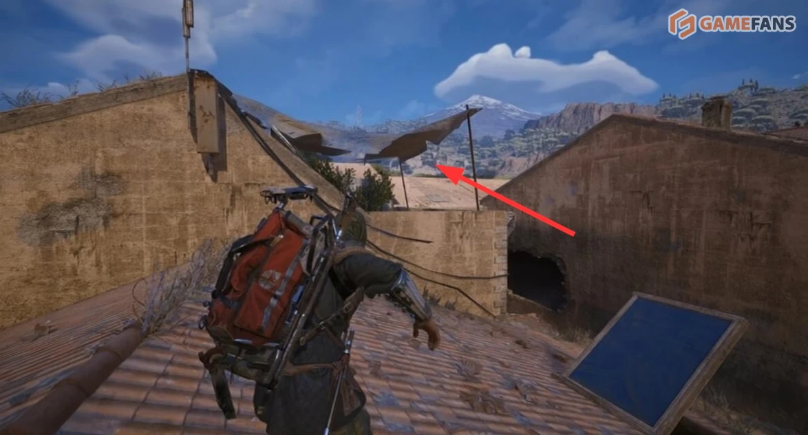 Сначала необходимо отыскать террасу на крыше. Для этого направляйтесь в нижнюю часть Погребенного города, к области «Плаца Роза». К юго-западу от этой локации находятся дома, частично занесенные песком. Осматривая здания, найдите крышу, над которой натянут синий брезент — именно там расположена нужная терраса.