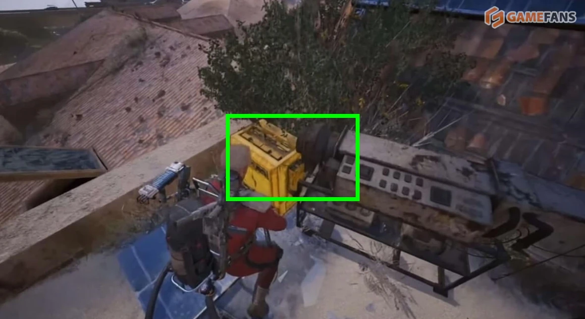 Поднимитесь на крышу и найдите электрический щит. При активном задании он будет выделен желтой отметкой. Вставьте в панель три провода, чтобы восстановить работу системы. После этого механизм активируется и задание будет завершено.