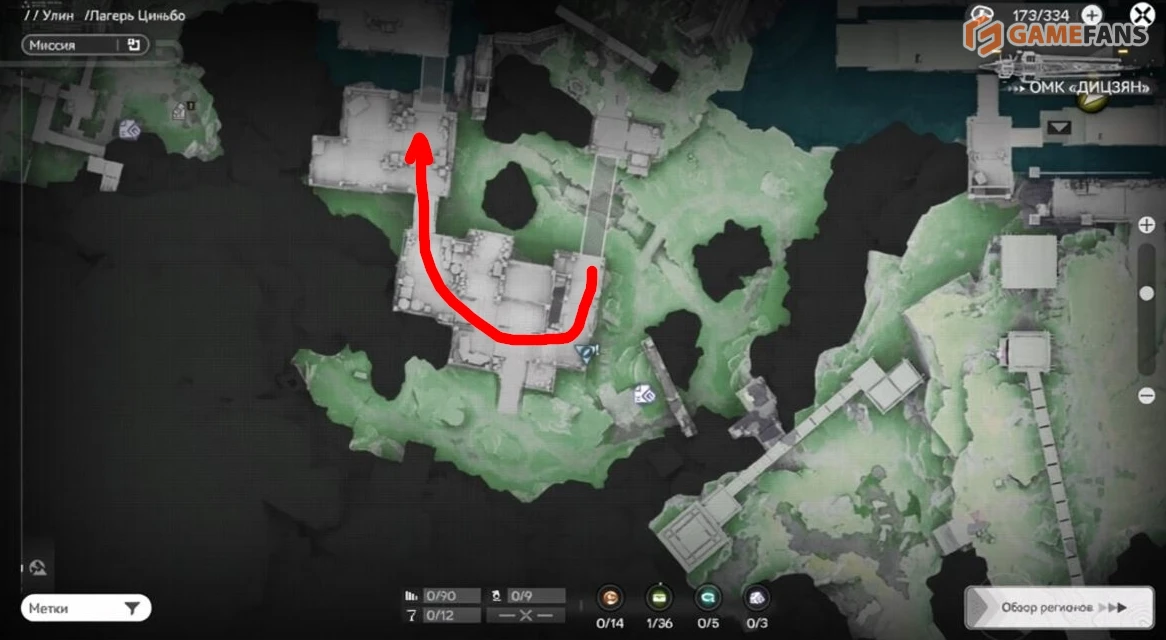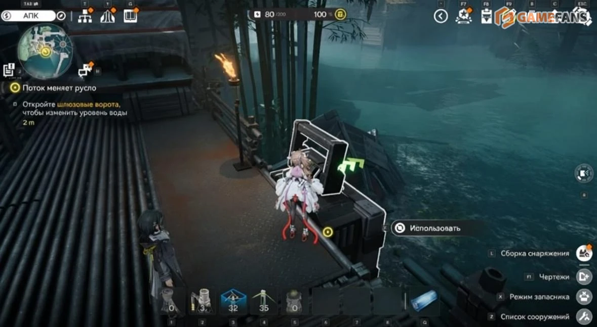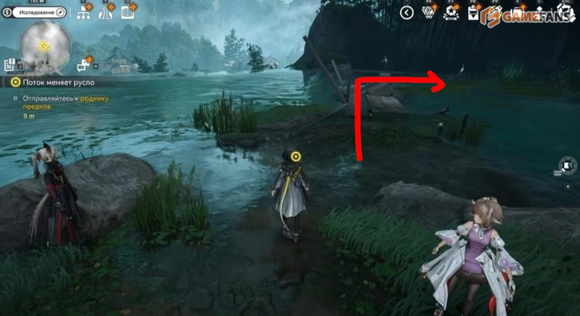 Первым делом необходимо активировать механизм на мосту, который отвечает за регулирование уровня воды. Включив устройство, вы сможете спустить воду и открыть дальнейший путь внутрь лагеря Циньбо. После этого поднимитесь к мощеной тропе, воспользовавшись тросом для подъема.