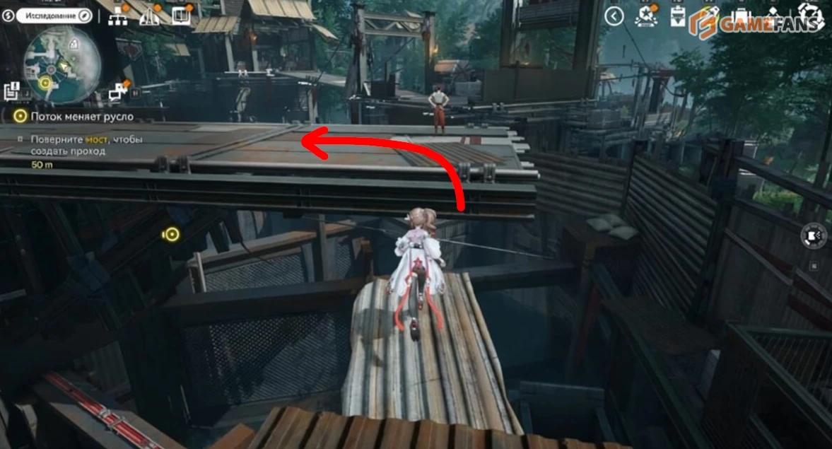 Чтобы продолжить движение, поднимитесь на крышу ближайшего сооружения, ухватившись за трос рядом. После этого используйте инструмент и чистую воду, чтобы опустить мост.