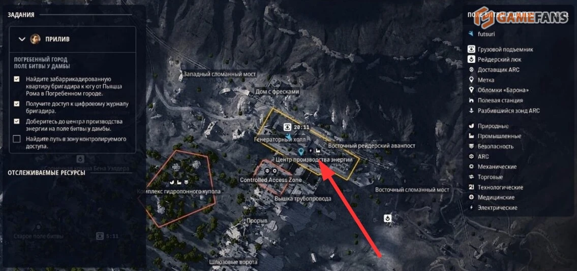 Следующий этап проходит на карте «Поле битвы у дамбы». Направляйтесь в северную часть и найдите «Центр производства энергии». Достаточно пробежать мимо ориентиров вроде разрушенных автобусов — заходить внутрь комплекса не потребуется.