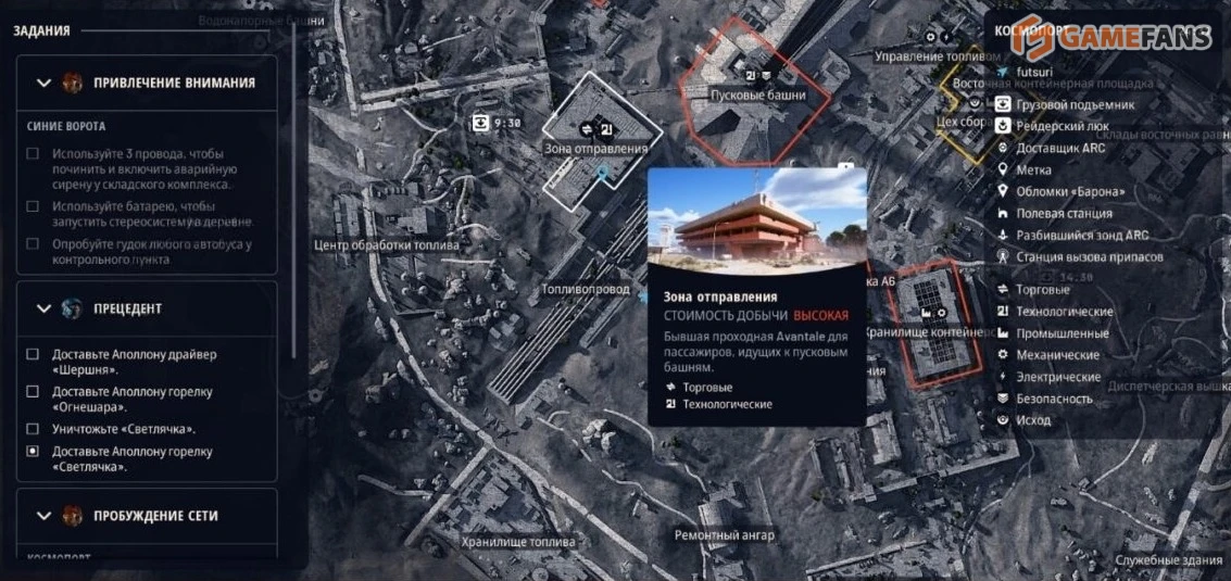 После активации вышки направляйтесь в Зону отправления. Вход в здание находится в юго-восточной части, между двумя пандусами. Подойдя со стороны Топливопровода, ориентируйтесь на ряд высоких вертикальных окон и вытянутый овальный проем справа от них — именно через него можно попасть внутрь.