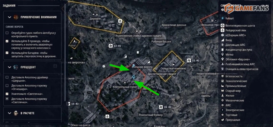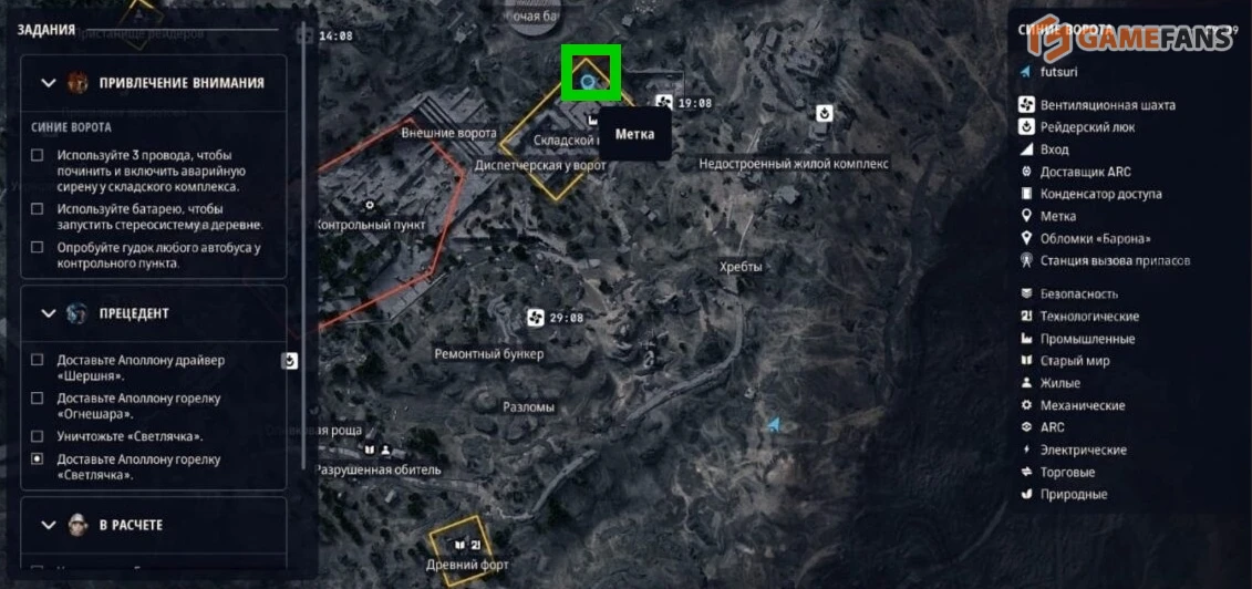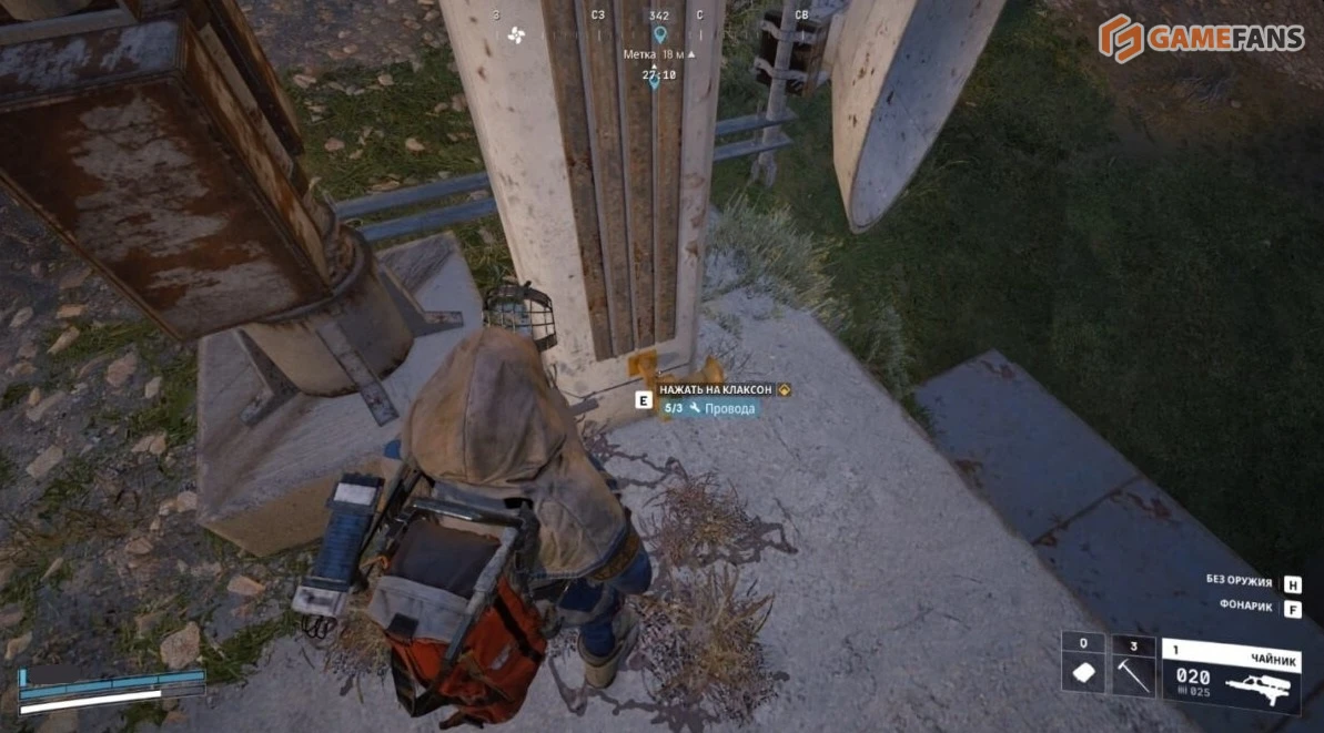 Первая точка назначения — Складской комплекс. Двигайтесь в его северную часть. Там, на крыше, переходящей в скалу, находится высокая вышка.