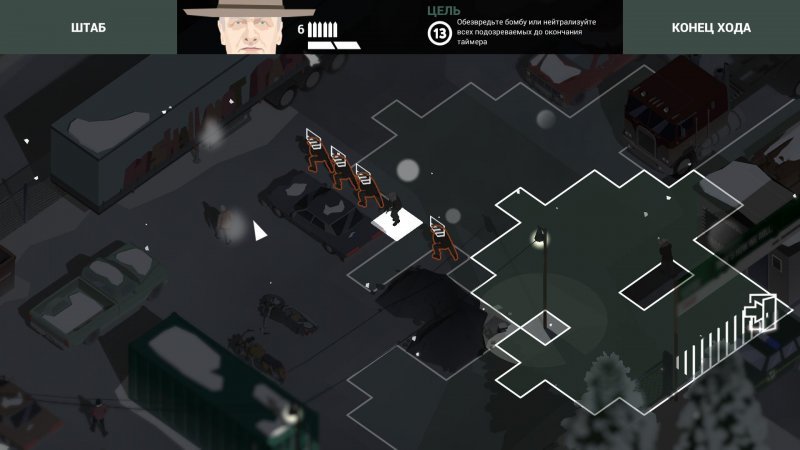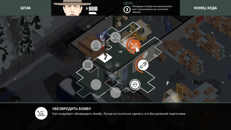Следующим серьезным делом станет штурм склада, где наблюдается подозрение на взрывчатку. Тут нужно будет или ликвидировать всех преступников, или вовремя обезвредить детонатор (всего на успешное выполнение миссии вам дадут 12-13 ходов). Детонатор расположен в дальнем помещении (если смотреть на экран, то нужно двигаться вверх), а проникнуть в здание вы сможете справа-сверху или слева-сверху.