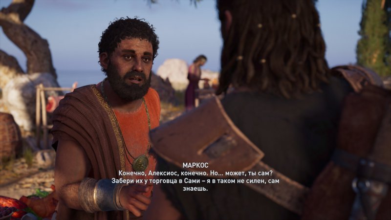 После посещения пляжа отправляемся на виноградник. В торговой лавке поселения Сами рядом с доками есть торговец Дурис. С ним вы можете взаимодействовать несколькими вариантами: заставить заплатить, разбив кувшин, убить или пощадить, покинув лавку без денег. В Храме Зевса находим Маркоса, после беседы с которым двигаемся за девушкой в лавку и получаем отремонтированный лук.