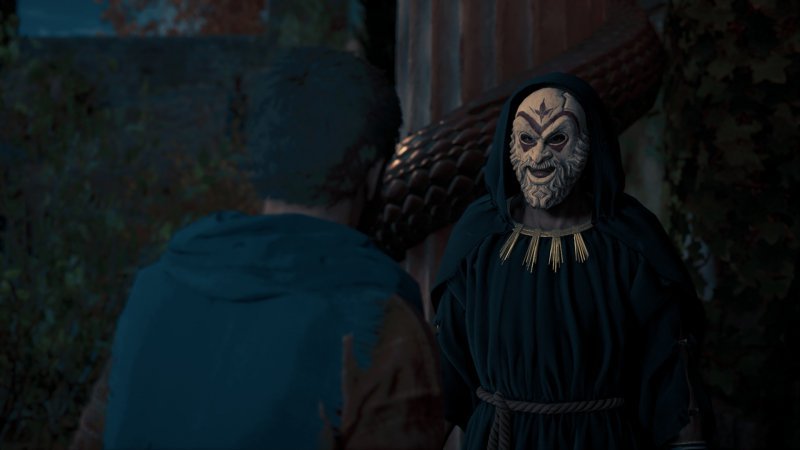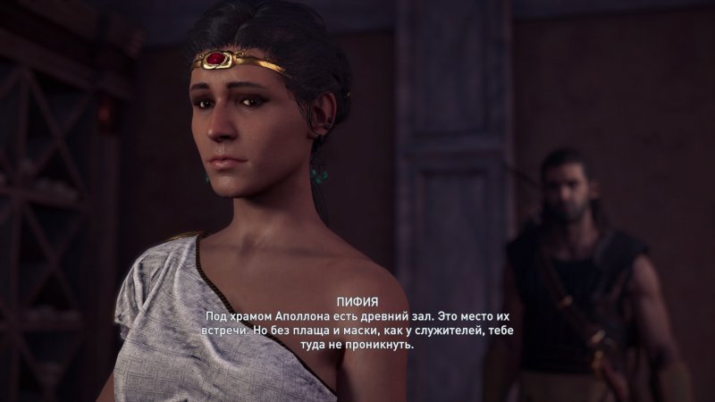 Возвращаемся в святилище Дельфы, встречаем Геродота около входа в храм с двумя колоннами. Когда ваш персонаж облачится в украденный чуть ранее костюм культиста, отправляйтесь в храм. Спускаемся в главный зал, обыскиваем локацию и общаемся с другим НПС, стоящим в центре. В комнате с водопадом ищем заметку, а потом в помещении на северо-западе разбираемся с членом культа, пытающим какого-то человека.